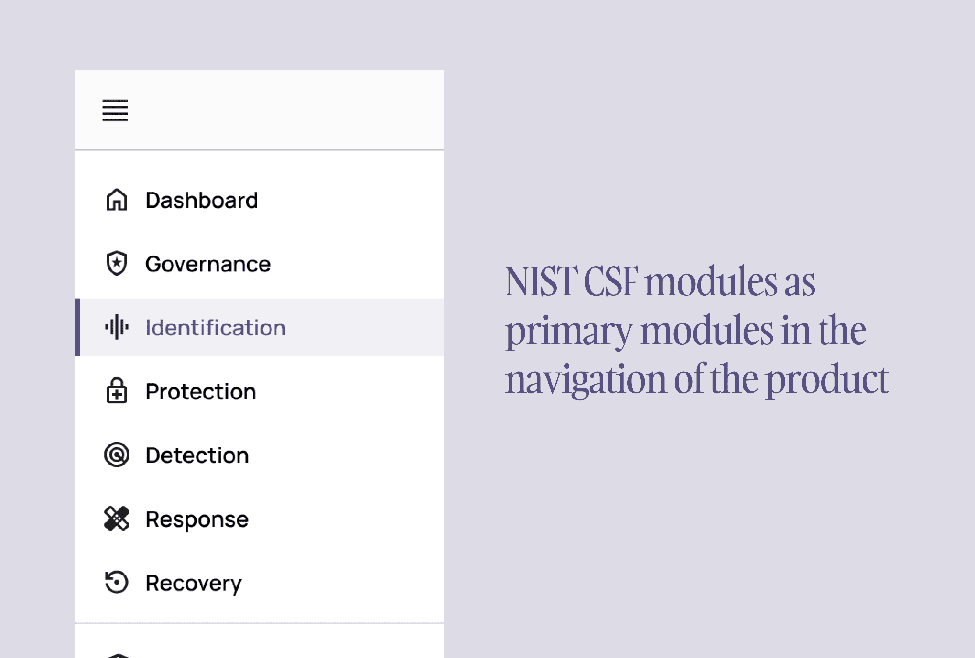 The domain required significant upfront research: studying the NIST CSF, understanding the two primary user roles, and learning the language of cybersecurity operations before any wireframes were drawn. I worked closely with the CTO to map the IA against the six NIST modules, then defined the sub-functions and data points within each. Since the detailed IA is under NDA, it cannot be presented here, but this foundation directly determined every structural decision in the product. Wireframes were produced for all modules before moving to high-fidelity in Carbon Design System.